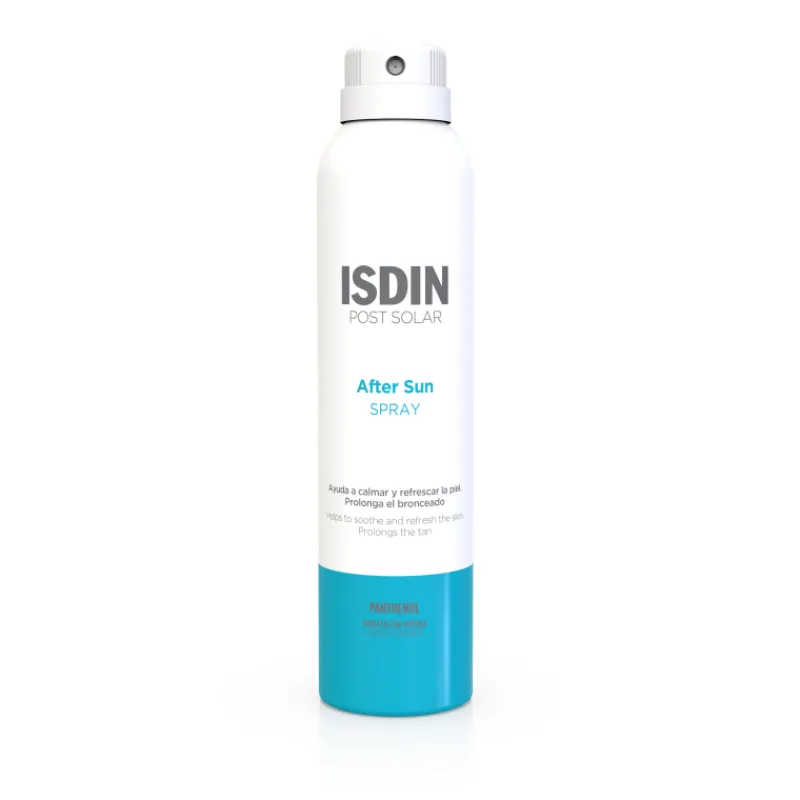 Agita y pulveriza After Sun Spray sobre la piel después de la exposición solar.