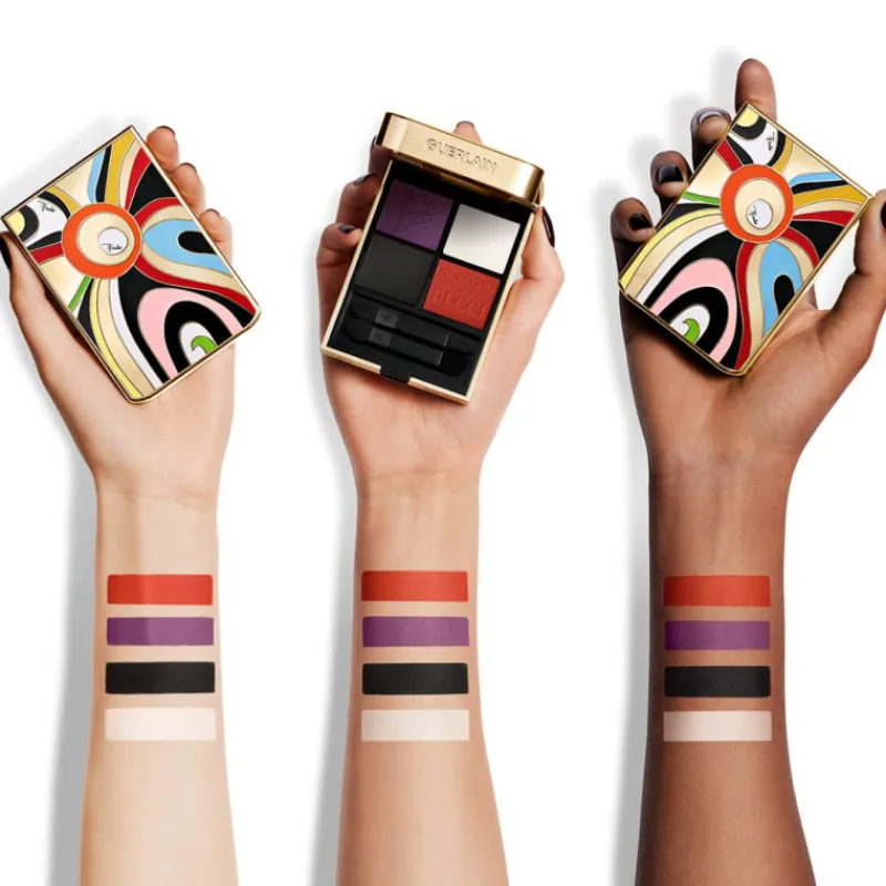 Ombres G Sombras de ojos en 4 tonos Edición limitada de Guerlain. Camille Miceli, directora artística de Pucci, y Violette, Directora Creativa de Maquillaje de Guerlain, fusionan sus talentos para crear Ombres G 045 Marmo Vibe, inspirada en el emblemático motivo Marmo de Pucci.