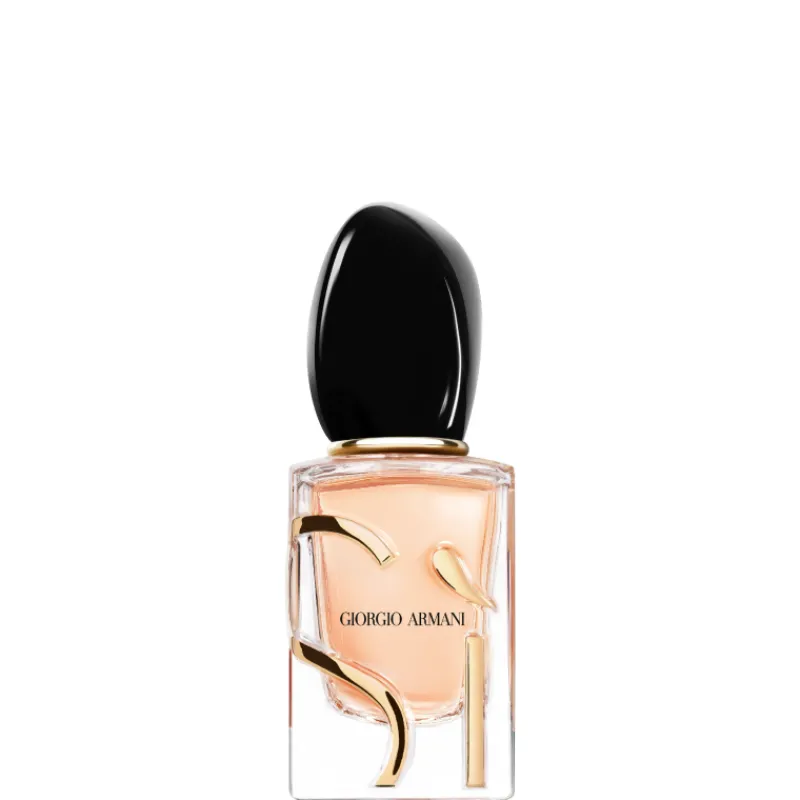 El icónico Sì Eau de Parfum ahora recargable, se presenta en un nuevo frasco grabado con el logo Sì en color dorado.