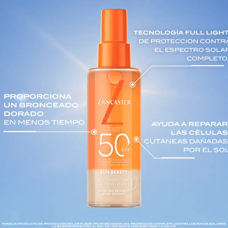 Protege tu piel más allá del cuidado tradicional contra los rayos UV con Sun Beauty Sun Body Water SPF50 de Lancaster, n.º 1 en protección solar de prestigio en Europa.