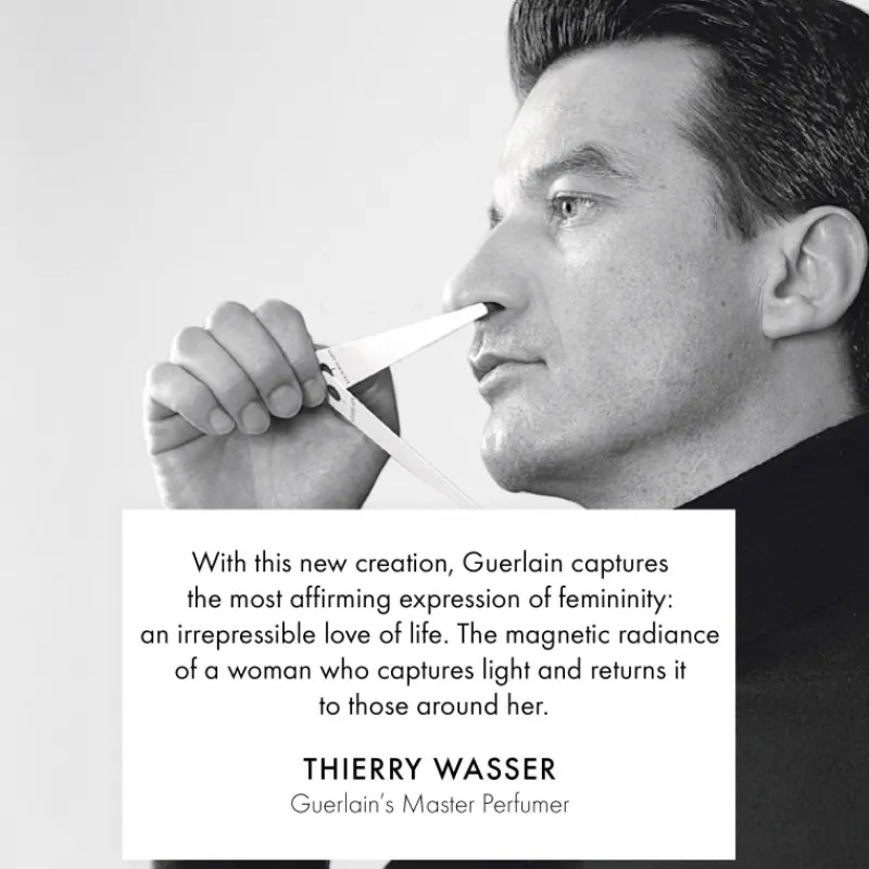 Es la huella olfativa de una personalidad resplandeciente. Una fragancia facetada como una joya, que reinterpreta en un registro afrutado e intensamente luminoso los ingredientes esenciales de Mon Guerlain: lavanda, jazmín Sambac, vainilla Tahihensis y sándalo. Un acorde de pera insufla una apertura alegre a esta composición. Una sonrisa irresistible… Chispeante y desenfadada, funde sus acentos afrutados en un corazón floral contrastado, donde la frescura de la lavanda matiza los acentos solares del jazmín. Además, la lavanda aporta su delicioso perfume: situada dentro de las notas amaderadas y cremosas del sándalo, deja una estela oriental tierna y sensual.