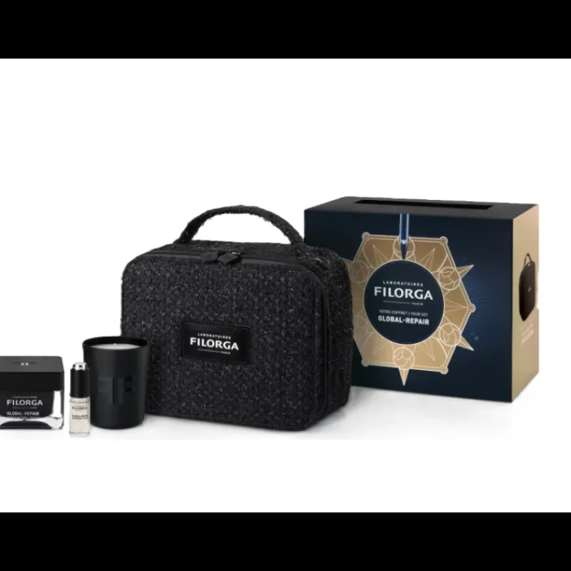 FILORGA GLOBAL-REPAIR ADVANCED CREAM crema de día y noche antienvejecimiento 50 ml + FILORGA GLOBAL-REPAIR ADVANCED ELIXIR sérum intensivo antienvejecimiento 5 ml + FILORGA MINI SCENTED CANDLE vela 75 g + FILORGA VANITY POUCH neceser