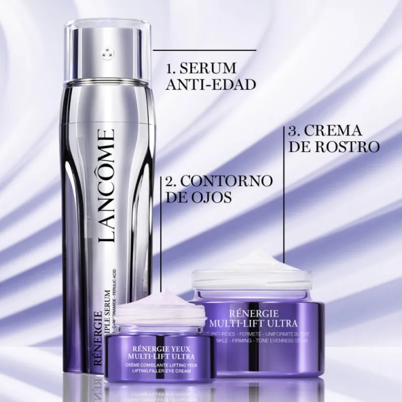 4. Para potenciar los resultados de tu rutina anti-edad con un extra de nutrición e hidratación a la vez que potenciando la fotoprotección en tu rostro, te recomendamos utilizar la crema de rostro Rénergie Multi-Lift Ultra y el contorno de ojos Rénergie Yeux Multi- Lift Ultra.