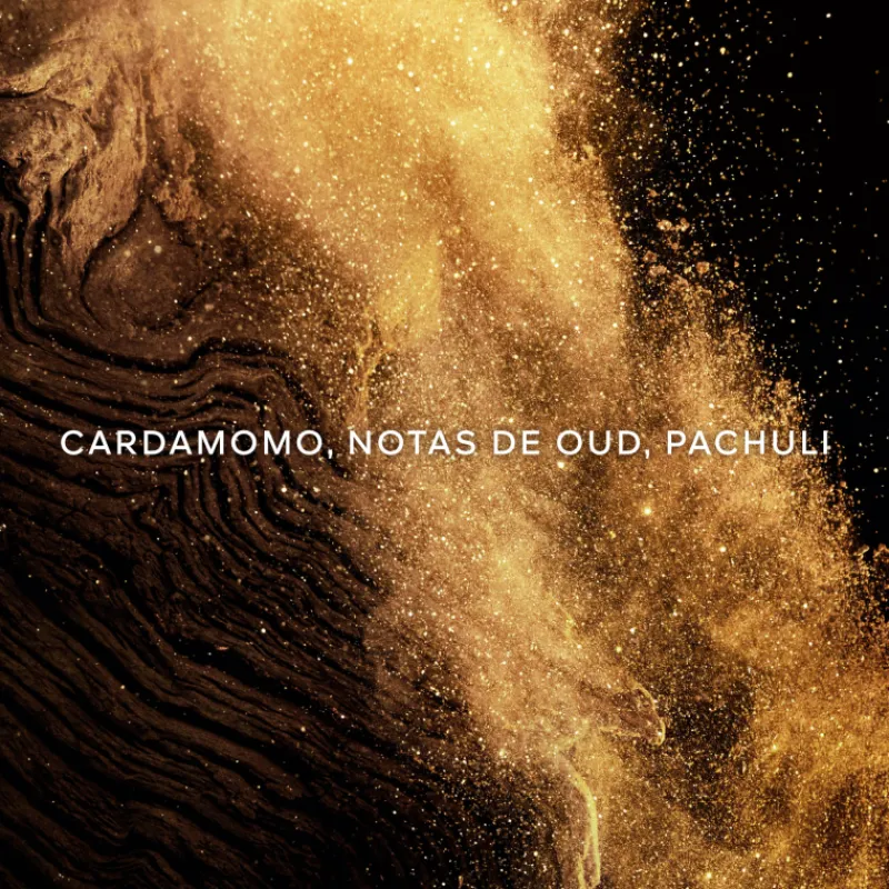 Un claroscuro olfativo en el que el cardamomo revela la ardiente elegancia de sus facetas frescas al entrar en contacto con un fondo cálido e intenso, matizado con pimienta negra y notas amaderadas de oud y de pachulí.