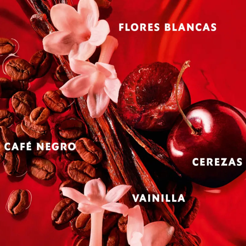 Esta fragancia mantiene la característica distintiva del reconocido Black Opium: el cautivador café negro, profundo, enigmático y refinado. La combinación de jazmín y flor de naranjo genera una explosión que añade luminosidad a la fragancia. El toque de cereza roja distingue a este perfume, oscilando entre una dulzura sensual y un matiz ácido.