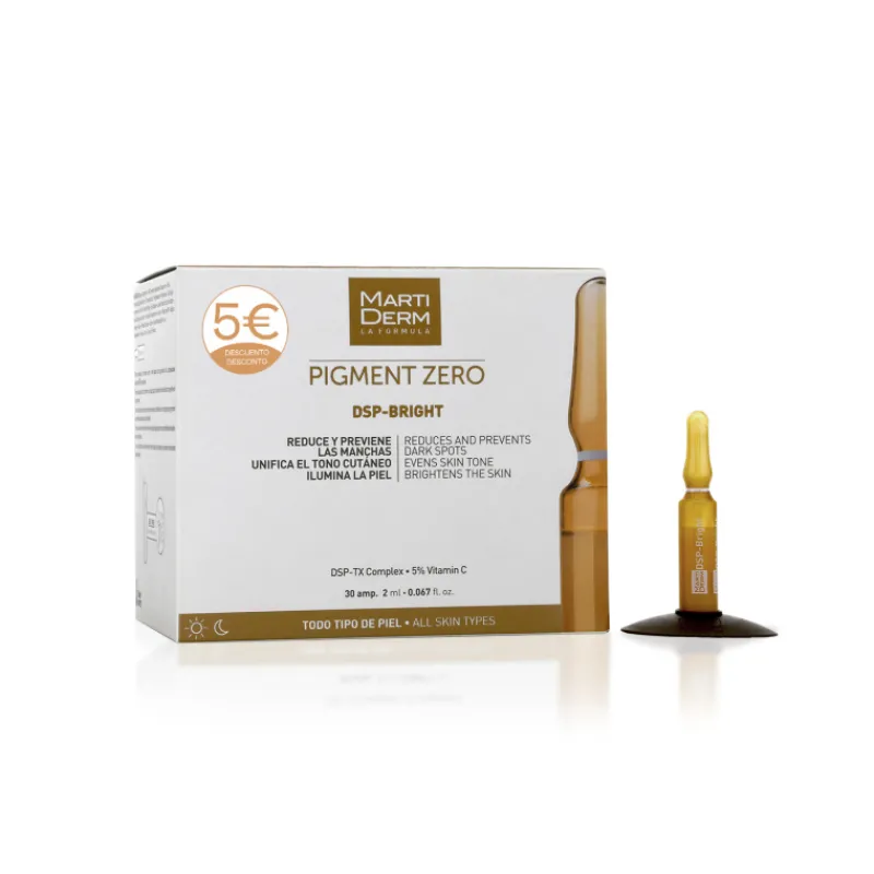 MARTIDERM DSP-Bright – 30 ampollas contiene activos despigmentantes selectivos que solo actúan donde hay manchas: unificando el tono cutáneo y ayudando a reducir y prevenir su aparición.