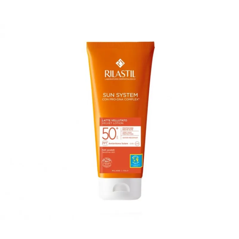 Rilastil Sun System Loción Velvet SPF50+ es una loción velvet suavizante, de fácil aplicación con protección de alto espectro de las radiaciones UVB-UVA y de acción antioxidante. Previene la aparición de quemaduras, manchas y eritemas solares. Tecnología exclusiva Pro-DNA Complex