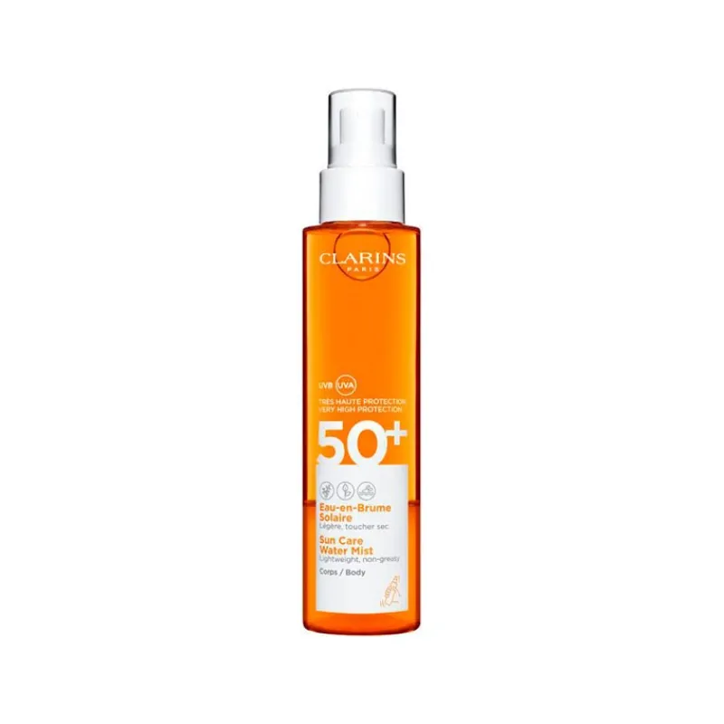 Clarins Eau-En-Brume Solaire Spf50+. Bruma ultrafina de alta protección solar para piel y cabello. De rápida absorción y acabado satinado, con una textura no grasa.