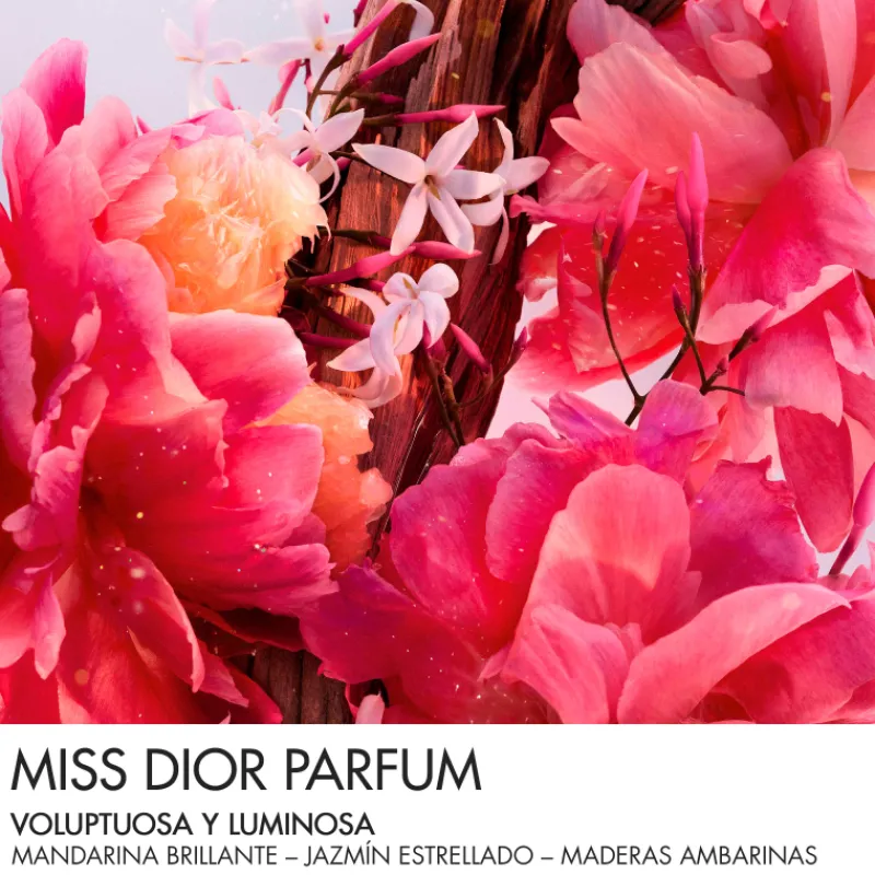 Miss Dior Parfum es un bouquet floral y afrutado, en el que predomina una generosa nota de jazmín estrellado que contrasta con la voluptuosidad de los acordes de maderas ambarinas.