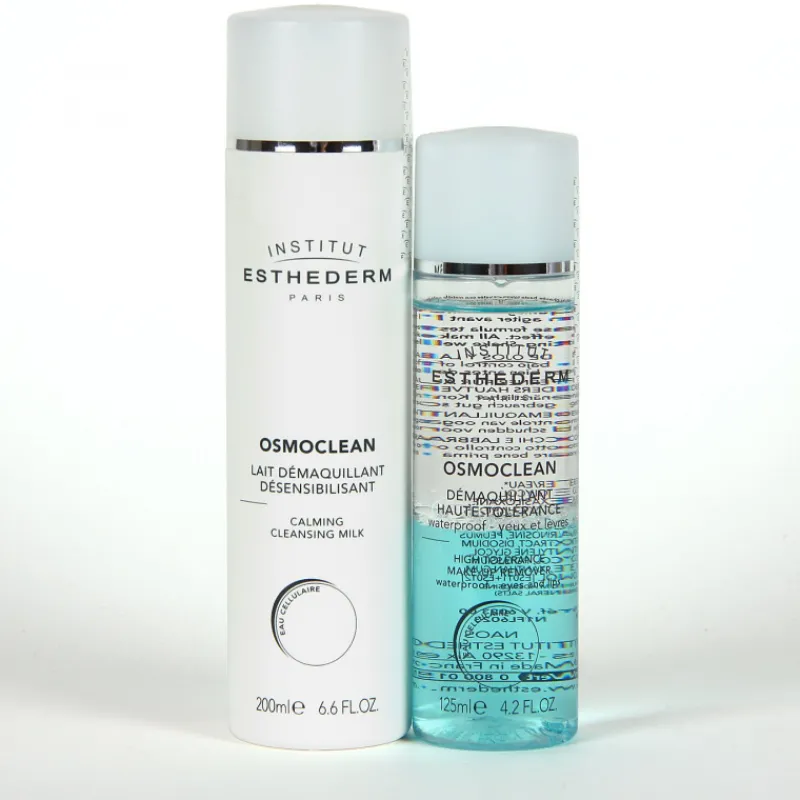 Esthederm Osmoclean Leche Desmaquillante Desensibilizante + Desmaquillante de ojos es un completo pack de cuidados desmaquillantes formado por Osmoclean Leche Desmaquillante Desensibilizante, un tratamiento limpiador extrasuave con una base de alta tolerancia que ayuda a desmaquillar las pieles más sensibles. Además, Osmoclean Desmaquillante Alta Tolerancia Ojos y Labios actúa con suma delicadeza para desmaquillar, limpiar y purificar ojos y labios respetando el equilibrio de la flora cutánea.