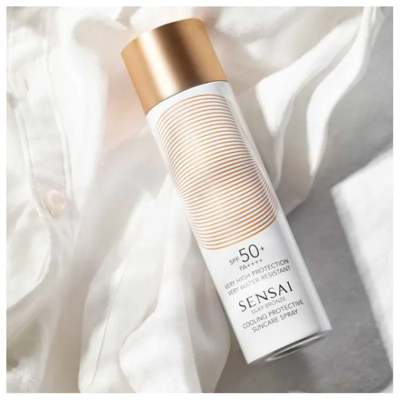 Sensai Silky Bronze Cooling Protective Suncare Spray Spf50+. Spray solar antiedad para rostro y cuerpo que aporta una hidratación refrescante a la vez que envuelve la piel en un velo sedoso y luminoso que la protege de los rayos UV.