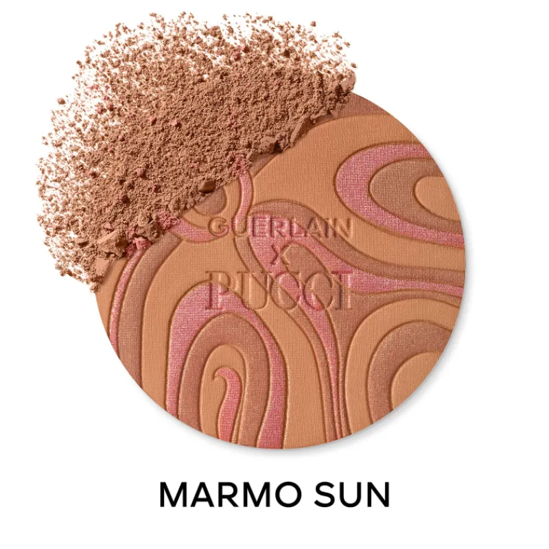 Camille Miceli, directora artística de Pucci, y Violette, Directora Creativa de Maquillaje de Guerlain, fusionan sus talentos para ensalzar los míticos polvos Terracotta con el emblemático motivo Marmo de Pucci. La combinación de dos tonos emblemáticos pulverizados con nácares rosados en un estuche de Alta Costura.