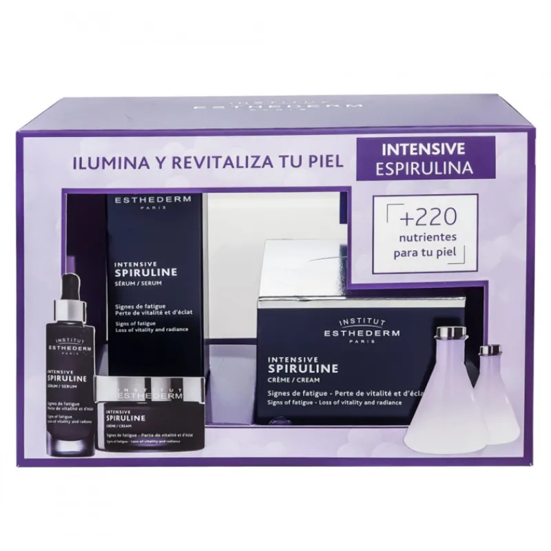 Cofre facial Intensivo ESPIRULINA, piel TONIFICADA Y REVITALIZADA contiene Serum 30ml de textura acuosa + Crema 50ml de texutra ligera y confortable, su piel mas nutrida, resistente, revitalizada y luminosa.