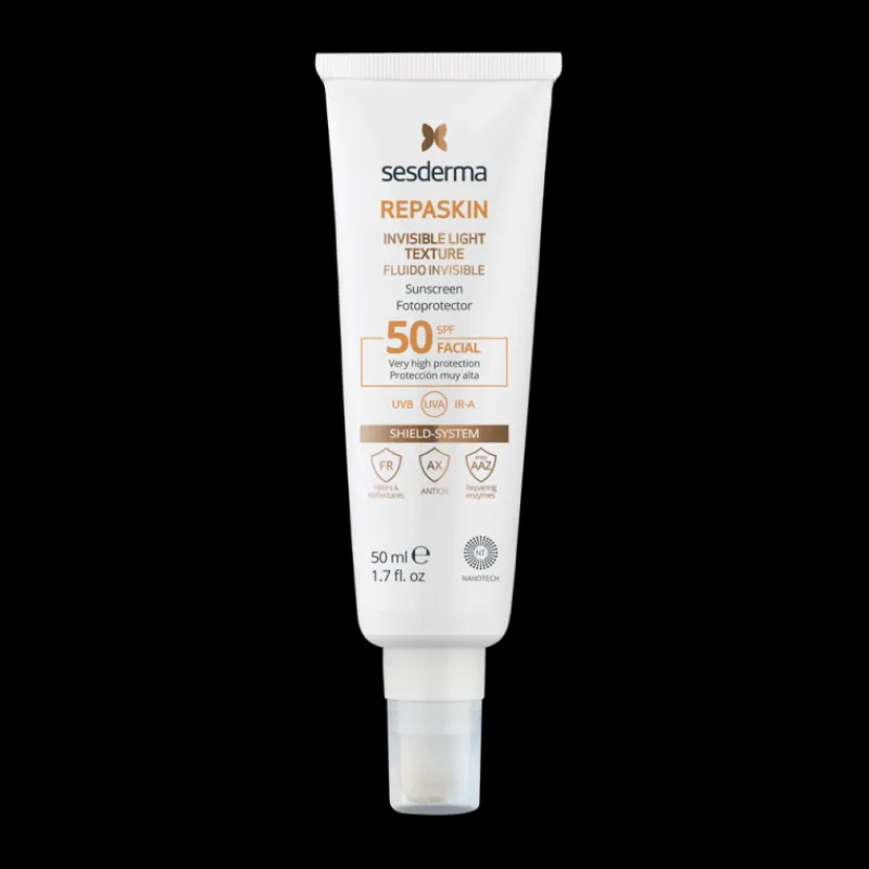 Repaskin Facial Fluido Invisible SPF50 tiene una textura fluida ultraligera, se absorbe rápidamente y no deja brillos ni efecto blanquecino.