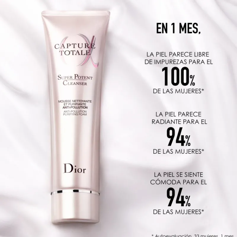 – La piel parece purificada de sus impurezas: exceso de sebo, restos de maquillaje y residuos de protector solar. La espuma Capture Totale permite eliminar el 85 %* de un producto de protección solar alta.